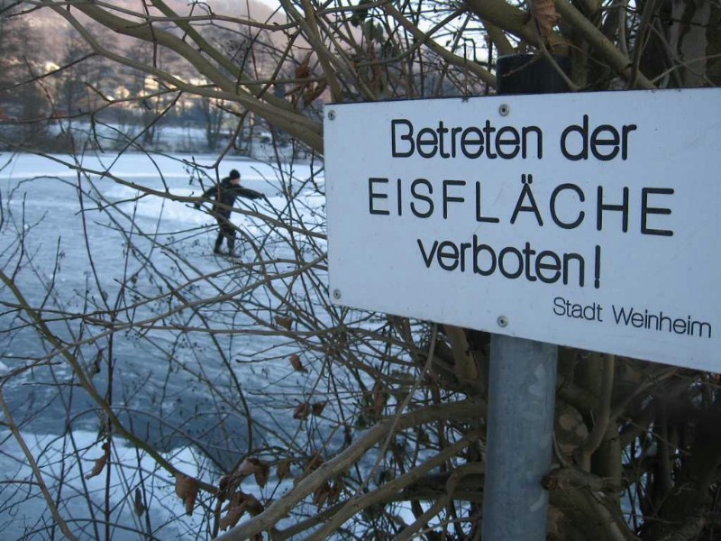 Winterzeit – Eissportzeit. Auch in Weinheim gibt es einige Flüsse, Seen, Bäche und offene Wasserrückhaltebecken. Faszinierend ist es, sonst unerreichbare Flächen zu Fuß oder mit Kufen unter den Schuhen zu durchqueren und die Landschaft aus einer ganz anderen Perspektive zu erkennen. Doch der Sport birgt erhebliche Gefahren, wenn es zu Eisunfällen kommt und Eisläufer in das Eis einbrechen.