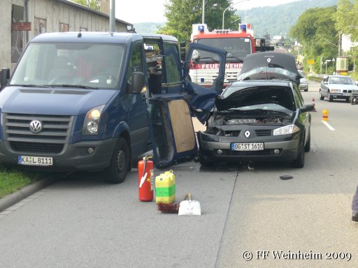 Zu einem Verkehrsunfall auf der B3 in Höhe des Güterbahnhof wurde die Feuerwehr Weinheim Abteilung Stadt am Montagabend gerufen. Aus bisher ungeklärter Ursache kollidierte ein Pkw mit einem Kleintransporter. Während der Fahrer des Kleintransporters unverletzt blieb wurde die Fahrerin des Pkw sowie ihre Tochter von der Feuerwehr bis zum Eintreffen des Rettungsdienst erstversorgt und betreut.