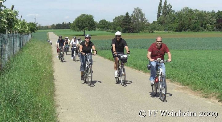 Prominenz hatte sich bei der diesjährigen Fahrradtour der Feuerwehr Weinheim Abteilung Stadt angekündigt. Landtagsabgeordneter Hans-Georg Junginger und Weinheims Stadtbrandmeister Reinhold Albrecht gesellten sich zu den Floriansjüngern und radelten die Strecke von Weinheim nach Reilingen mit.